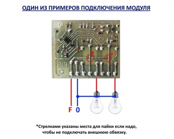 Пропоную готовий комплект для вирішення різних завдань з дистанційного керування, в комплектації до модуля йде маленький пульт, але модуль можна замовити і без пульта, тому що даний модуль можна "Навчити" до будь-якого Вашого побутового пульта від (телевізора, радіо, МР3 плеєра, DVD ітд), який працює за протоколом RC5, більшість пультів працює у цьому протоколі. Після навчання модуля до пульту, код кнопок запишуться у енергонезалежної частини пам'яті мікроконтролера і не зітруться у разі вимкнення електрики. У будь-який момент модуль може бути "навчений" під інший пульт за потреби. Приклад підключення модуля показаний на малюнку, щоб спростити подачу фази або нуля на центральні контакти реле, були нанесені спеціальні доріжки на платі, але доріжки не з'єднані до кінця, якщо ваша схема підключення і цілі використання модуля відрізняються від мого задуму. Якщо силові доріжки не з'єднувати у зазначених місцях – то контакти реле залишаються універсальними.