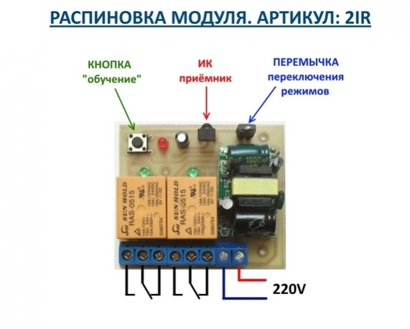 Дві кнопки на пульті дистанційного керування працюють з двома реле. Залежно від наявності перемички існує два режими роботи: З фіксацією (тригерний) - перемичка на місці, і без фіксації (на утриманні) - перемичка відсутня.