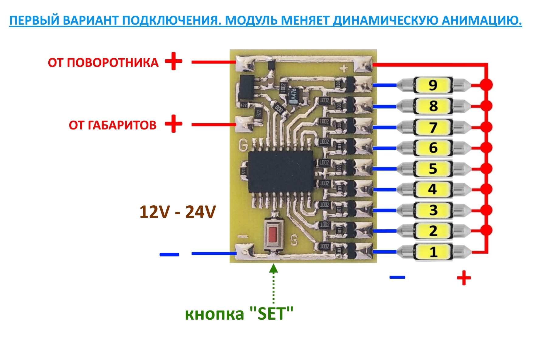 Даний модуль модуль змінює динамічний спецефект залежно включені габарити чи ні. Коли габарити (або фари) вимкнені, і вмикаєте поворот - то програється перша класична анімація поворотника. Якщо габарити включені і включає поворот - то вже програється друга анімація поворотника. За бажання даний модуль можна підключати і за класичною схемою (другий і третій приклад підключення), але в цьому випадку анімація повороту не змінюватиметься залежно від того, чи включені габарити чи ні. У всіх трьох варіантах підключення додаткових проводів тягнути не треба, адже додаткового проводу живлення модуль не потребує. Модуль дуже компактний і з легкістю вміститься усередині будь-якого стопа. А також за допомогою налаштувань можна "віддзеркалити" анімацію, це теж дуже полегшує встановлення модуля.