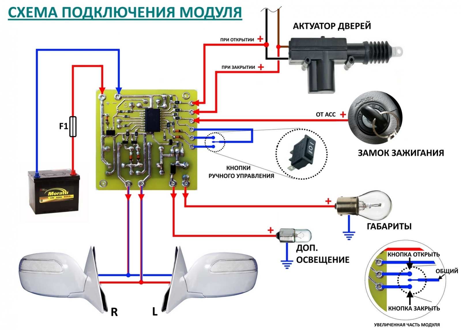 Підключення модуля. Модуль підключається згідно з наведеною нижче схемою. Кнопка ручного керування потрібна без фіксації, з автоматичним поверненням у нейтральному положенні, механічна, трьох контактна (NO-COM-NO). Якщо ручним складанням не користуватиметеся, тоді і кнопка не потрібна.