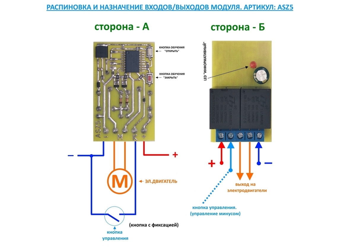 Підключення модуля. Модуль підключається згідно з наведеною нижче схемою, для підключення знадобиться всього лише п'ять проводів. Кнопка ручного керування потрібна будь-яка з фіксацією. Після підключення модуля за наведеною схемою, модуль треба навчити, а саме задати тривалість тимчасових сигналів керування на відкриття і закриття дзеркал. Для навчання на самому модулі є дві кнопки одна призначена для навчання режиму "Відкрити", а інша призначена для навчання режиму "Закрити". Примітка: "Відкрити" або "Закрити" це умовне поняття, вони можуть бути навчені і навпаки, адже модуль до навчання не знає, в який бік відкривається або закриваються дзеркала.
