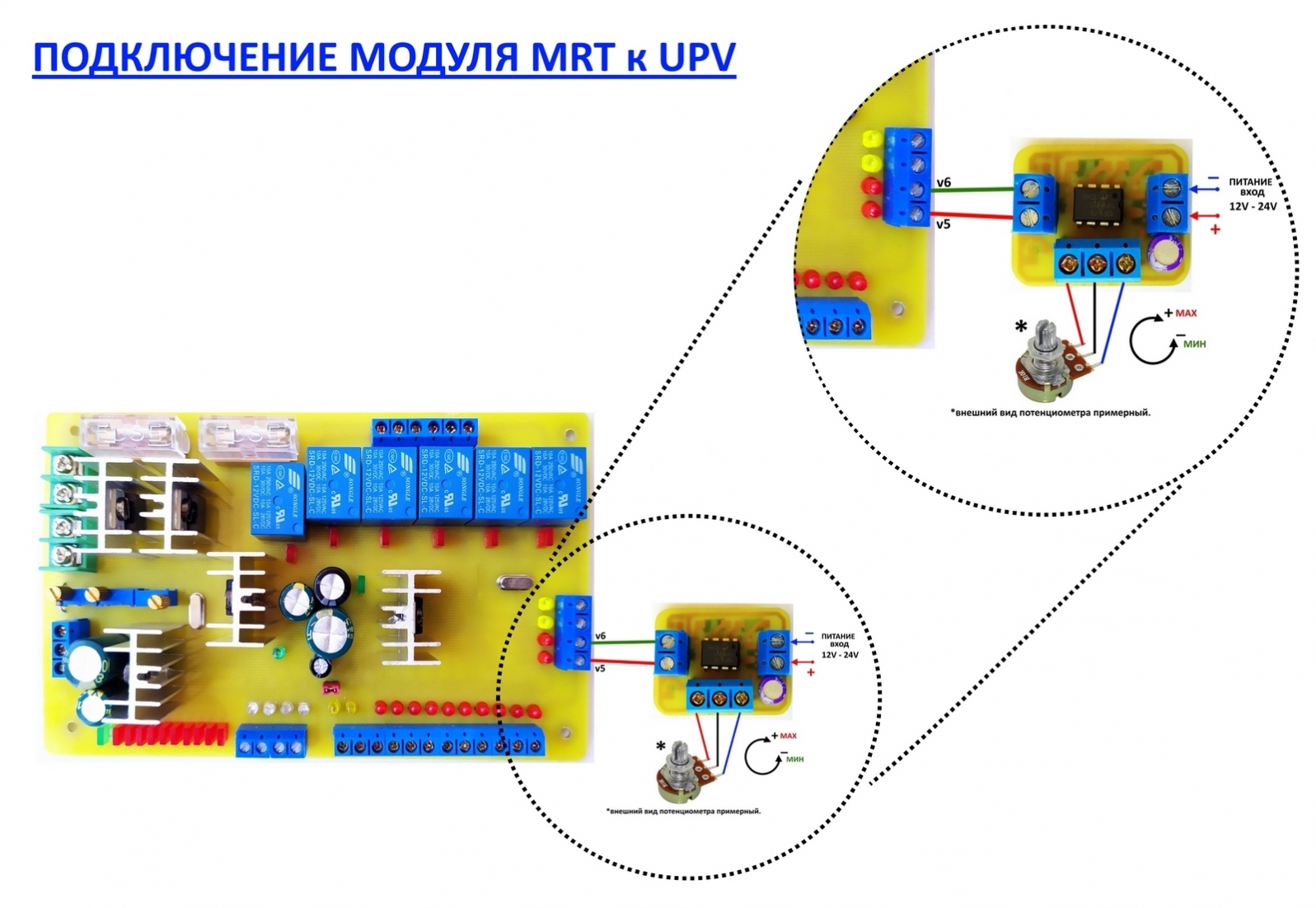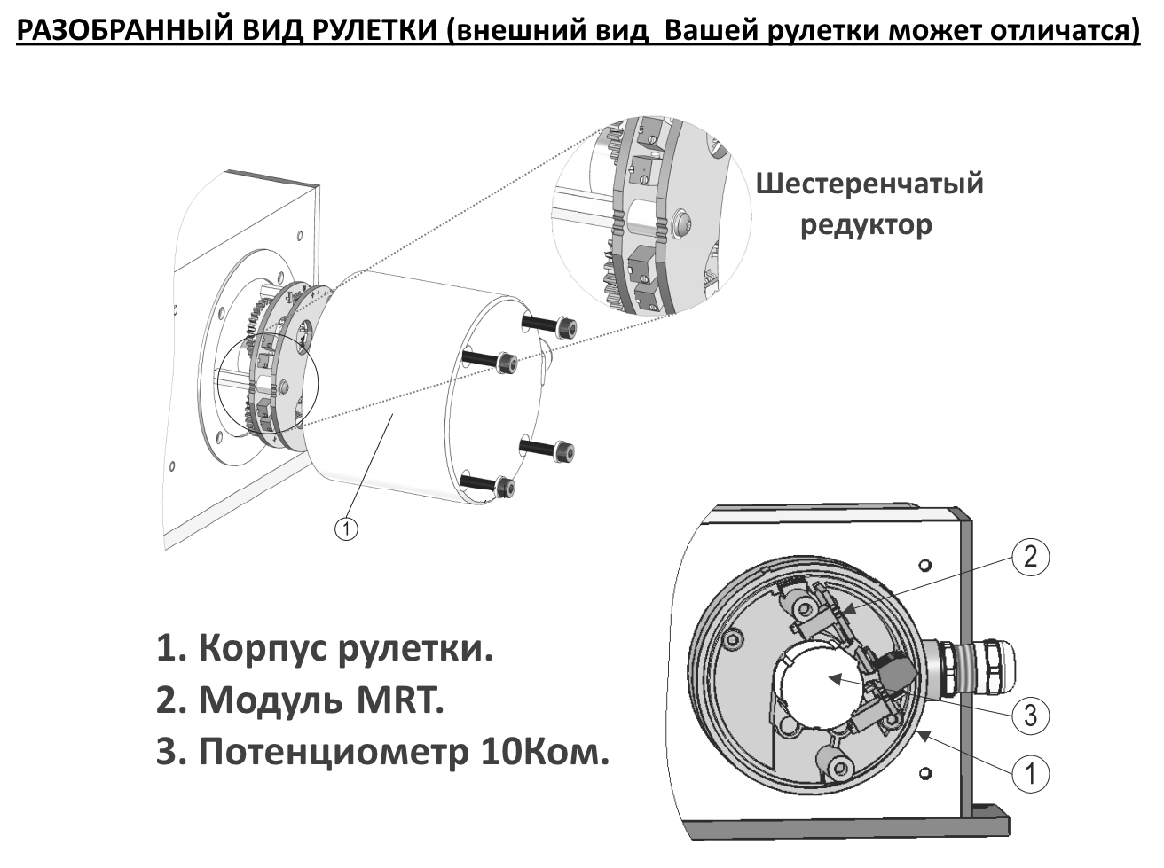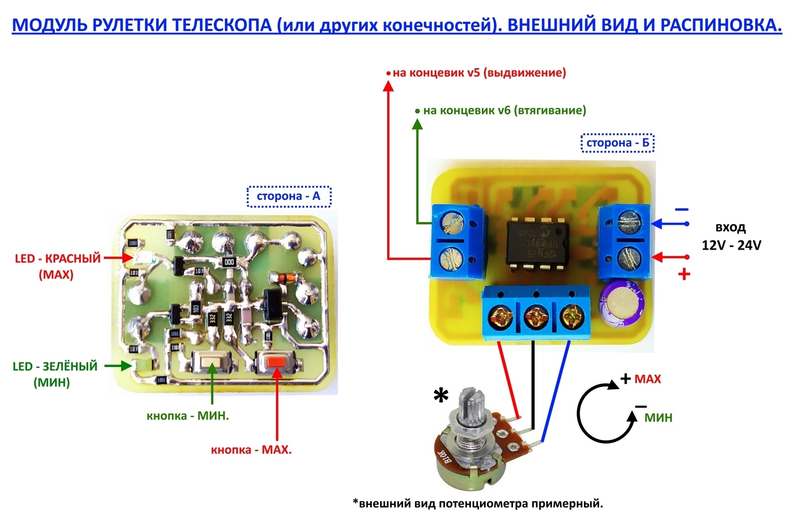 Підключення та налаштування. Модуль підключається за наведеною нижче схемою, але перед налаштуванням виходи на кінцевики (v5 і v6) тимчасово не підключаємо, потрібно підключати після проведення навчання модуля рулетки. Перед початком навчання рулетка та її потенціометр повинен бути на своїх місцях, а потенціометр підключений до модуля.