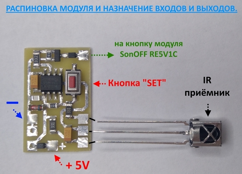 Пропоную вашій увазі модуль для розширення можливостей у модуля SonOFF RE5V1C, а точніше, щоб з'явилася можливість керувати ще з будь-якого пульта від побутової техніки. Вміє працювати пультами з кодуванням RС5 та NEC. Модуль від компанії SonOFF не входить до комплектації. На даному відео на цій сторінці все показано, та особливо нема чого додати.