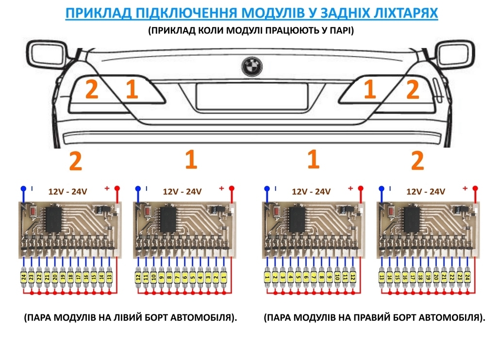 Як я вже написав вище модуль може працювати поодинці - коли використовується всього по одному модулю на кожен борт автомобіля. І в парі - по два модулі на кожен борт автомобіля для стопів, що складаються з двох частин (по одному модулю в кожну частину стопа), при цьому комбінація кількості каналів може бути абсолютно будь-яка від 2-х каналів 12-ї, на будь-якій з окремих частин стопа. Для правильної роботи потрібно задати необхідний код з поданих нижче. Усього 15 кодів є. Перший код відноситься до режиму роботи модуля поодинці, коли використовуються всього два модулі, по одному на кожен борт, або коли працюють у парі але він встановлений буде на 5 дверi або багажнику, і з нього починає пробігати спецефект. З 2-го по 12-й код задається тільки в тих випадках, коли передбачається використання модулів для роботи в парі, і відноситься ТІЛЬКИ до другого модуля, що встановлюється на борту автомобіля. Сам код означає і повідомляє контролеру, скільки каналів ви підключили на ПЕРШОМУ модулі, таким чином він зробить правильні поправки в прошивці для правильної затримки на включенні другого модуля і синхронізації роботи. Код з 13 по 15 є резервними, та необхідні для зміщення анімації на другому модулі - Коли на першому модулі використовуються всі 12 каналів, та потрібна додаткова затримка.