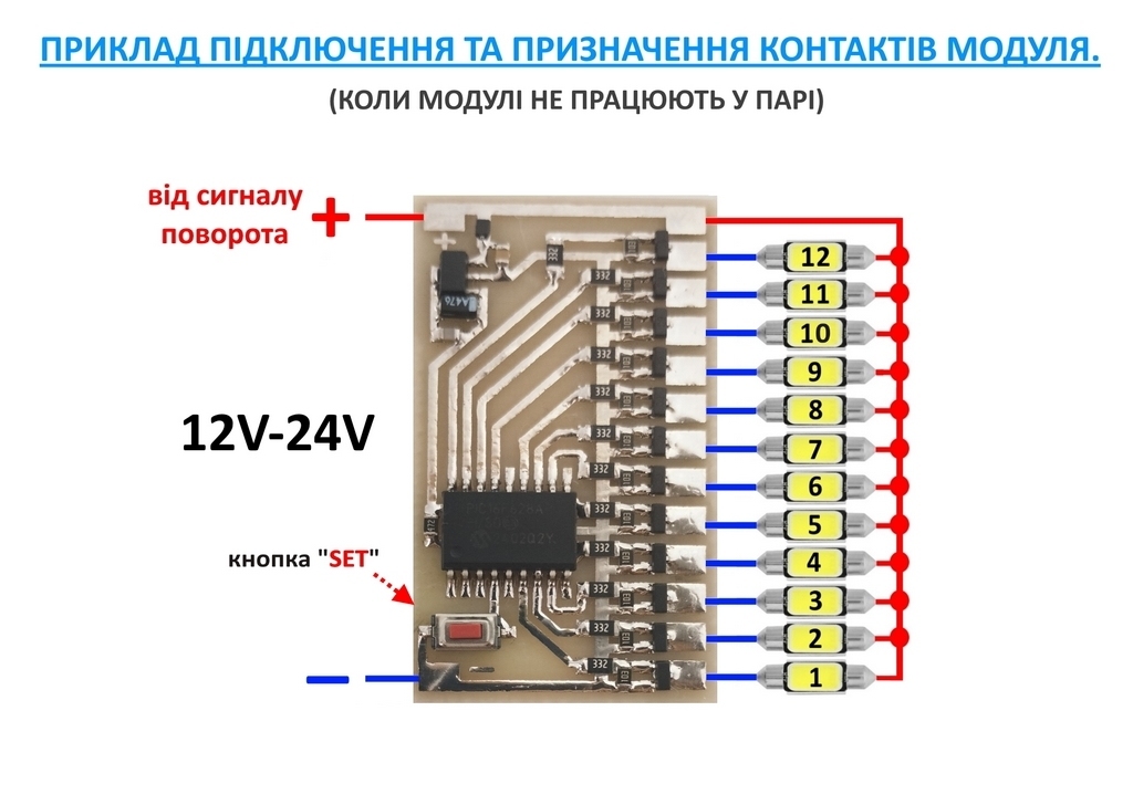 Цей модуль повністю настроюється за допомогою лише однієї кнопки, можливо змінити параметри та функціонал (без перепрошивки). Кнопка має два режими, коротке натискання (до 3 секунд) - перший режим зміни швидкості виконання спецефекту, довге натискання (більше 3 секунд) - другий режим, служить зміни роботи модуля в одиночному режимі чи у парі). Модуль 12 канальний, може працювати як самостійно, так і в парі з іншим таким же модулем, для спільної роботи в стопи що складаються з двох частин, що полегшить установку, адже додаткових проводів не треба тягнути. У кожному модулі можна вказати, скільки каналів реально буде підключено на першому модулі (якщо не буде підключено якусь кількість каналів). У модулі є всього один класичний спецефект - лінійка що подовжується, решта прошивки приділена для налаштувань. Швидкість виконання спецефекту можна налаштувати в межах: від 2ms до 24ms. Цей модуль підтримує зміну напрямку проходження анімації без перепаювання проводів.