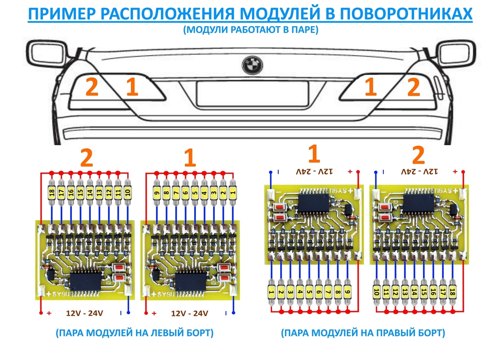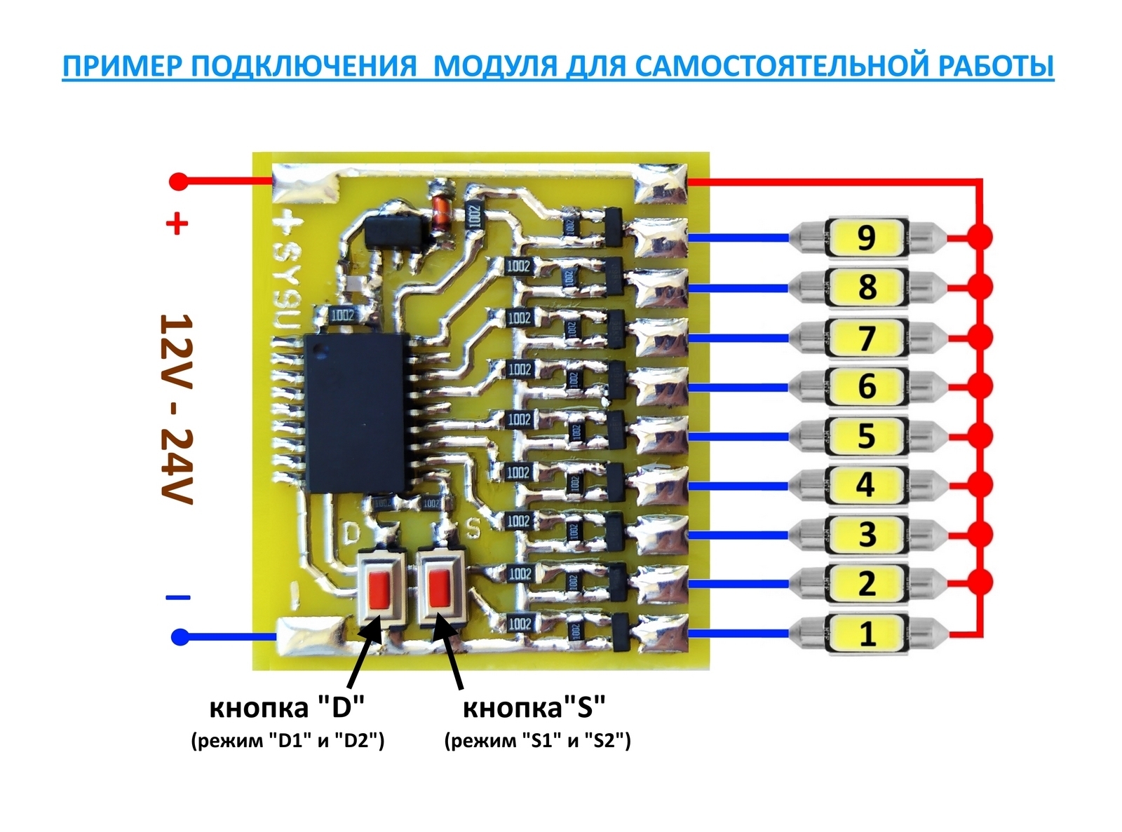 Цей модуль зроблений для найвибагливіших людей, він повністю настроюється, за допомогою двох кнопок можна змінити параметри та функціонал (без перепрошивки). Кожна кнопка має два режими, коротке натискання (до 5 секунд) – перший режим, довге натискання (більше 5 секунд) – другий режим. Модуль 9 канальний, може працювати як самостійно, так і в парі з іншим таким же модулем, для спільної роботи в стопи що складаються з двох частин, що полегшить установку, адже додаткових проводів не треба тягнути. У кожному модулі можна вказати, скільки каналів реально буде підключено (якщо не буде підключено якусь кількість каналів). На жаль через розширений функціонал стаття вийде досить довгою, у кого не вистачає терпіння читати великі тексти - рекомендую подивитися відео (сподіваюся нічого там не проґавив). У модулі є всього один класичний спецефект - лінійка що подовжується, решта прошивки приділена для налаштувань. Швидкість виконання спецефекту можна налаштувати в найширших межах: від 1ms до 255ms, і навіть можна налаштувати крок! Можна вказати кількість каналів, що використовуються: від 1 до 9 (звичайний варіант), і від 1 до 18 (робота в парі, для стопів що складаються з двох частин). Коли модулі працюють у парі, на другому модулі потрібно вказати скільки каналів реально підключили на першому модулі, цим ми вносимо поправки в прошивці, де автоматично вносяться потрібні затримки для коректної роботи.