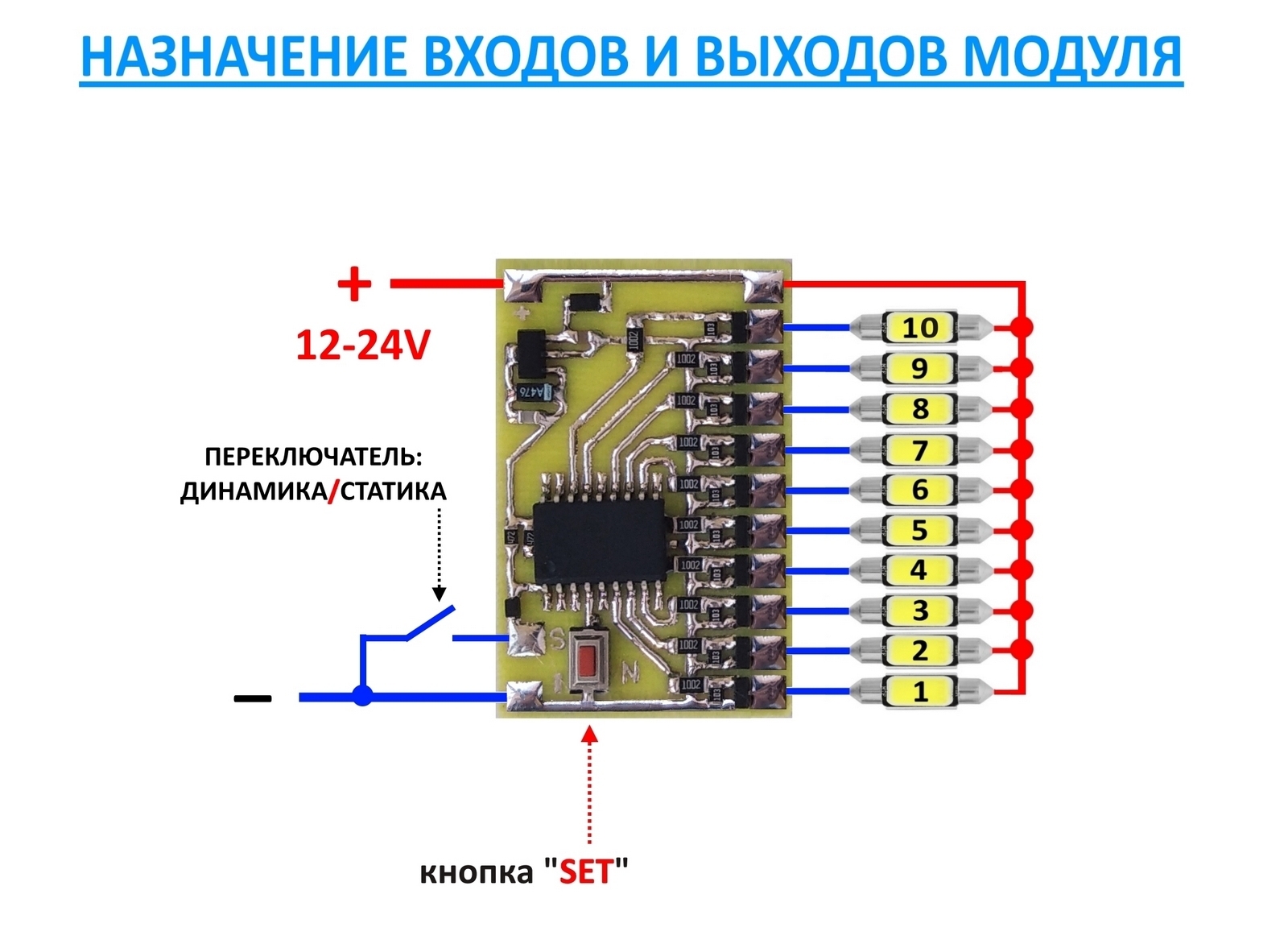 Цей модуль був створений на прохання мого знайомого. Модуль вийшов досить компактний, і з легкістю вміститься всередині будь-якого стопа. А також за допомогою налаштувань можна "віддзеркалити" анімацію першого класичного спецефекту, це теж дуже полегшує встановлення модуля. Загалом у прошивці вмістилися аж 7 динамічних анімацій, і одна з цих анімацій має свою віддзеркалену копію. Швидкість виконання динамічної анімації налаштовується, і легко підбирається з 10 існуючих під будь-яке реле поворотів. У модулі є можливість швидкого переведення модуля з динамічного ефекту на статику на "гарячу" не входячи в режим налаштувань! А також назад зі статики на динаміку. Для того, щоб перейти на статику, треба подати на спеціальний контакт на модулі мінус живлення (масу), від ручника або від окремої кнопки з фіксацією. Якщо ця функція не потрібна - то на цей контакт нічого не підключаємо, ця функція є опціональною. На модулі застосовуються транзистори з максимальним навантаженням що підключається до 500мА, якщо Вам знадобиться модулі з більш потужними транзисторами з можливістю підключати навантаження до 2А на канал то залиште примітку до замовлення, обов'язково виконаю Ваше прохання.