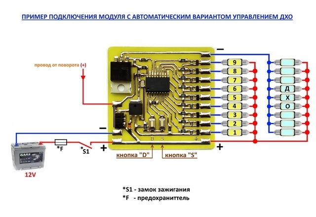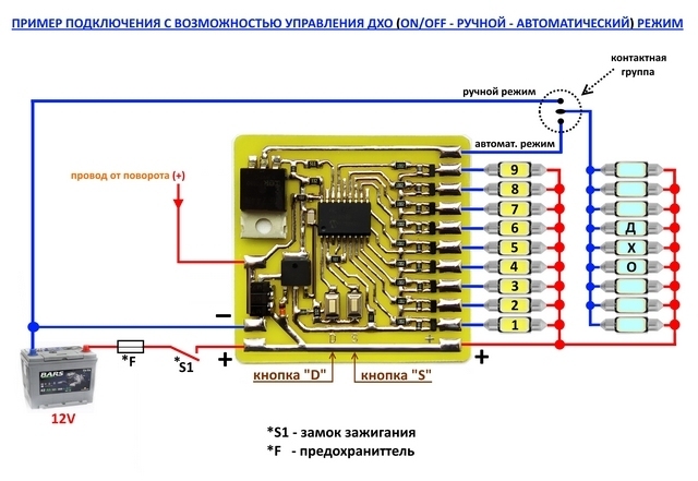ДХО автоматичний, але якщо у Вас є потреба в можливості вибору між автоматичним управлінням ДХО і ручним - тоді додаю нескладну схему реалізації, для цього вам знадобиться лише один тумблер 3-х позиційний, 3-х контактний, або клавішний перемикач з такими ж характеристиками на необхідну потужність.