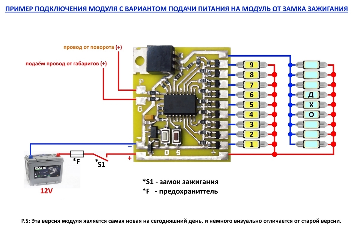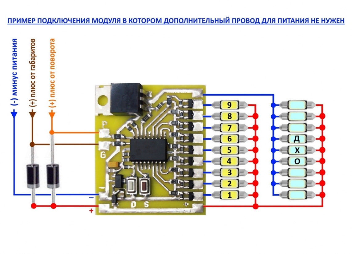 Нова версія 9-канального динамічного поворотника, плюс окремий канал для ДХО (денних ходових вогнів). До цього контролера можна підключати до 9 світлодіодів, або до 9 ланцюжків світлодіодів. Можна й менше. Транзистори на контролері стоять N-канальні, а це означає, що з транзистори на світлодіоди виходять мінуси. Плюс на світлодіоди приходить загальний.