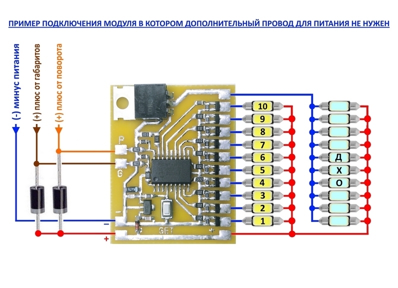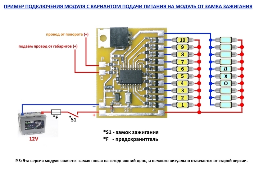 Нова версія 10-ти канального динамічного поворотника плюс окремий канал для ДХО (денних ходових вогнів). До цього контролера можна підключати до 10 світлодіодів, або до 10 ланцюжків світлодіодів. Можна й менше. Із транзисторів на світлодіоди виходять мінуси. Плюс на світлодіоди приходить загальний. Цей модуль є розширеною версією модуля артикул: SYDxo, і відрізняється збільшенням кількості каналів, налаштувань всього з однієї кнопки "SET", і заміною третього спецефекту.