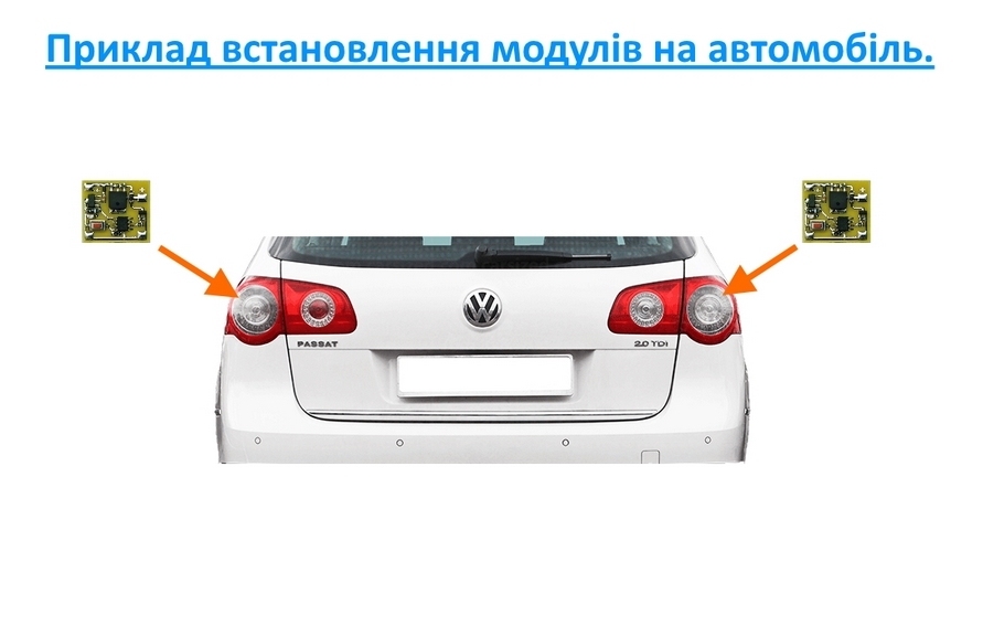 Версія динамічного поворотника, на 1 канал, та 25 швидкостей виконання з кроком у 10мс. Транзистор на контролері стоіть Р-канальний, а це означає що на виході буде плюс живлення, мінус приходить загальний. Для підключення модуля додаткові дроти не потрібно тягнути, і дроти автомобіля залишиться без змін, що дуже важливо. До вихіда модуля можливо підключити будь-які навантаження: прості лампочки, світлодіоди, ланцюги світлодіодів, світлодіоди та драйвери (стабілізатори струму). Цей модуль був розроблений для мого клієнта і був встановлений на автомобіль Volkswagen Passat B6, та йому подібних. Модулів зазвичай встановлюються 2 шт, по одному модулю на кожен борт автомобіля, на 3-й або 5-й двері не встановлюють так як там буде відразу включатися поворотники, а на бортах модулі створять необхідну затримку на включення, і створить ілюзію поворотника що біжить. На обидва модулі необхідно встановити однакові тимчасові затримки.
