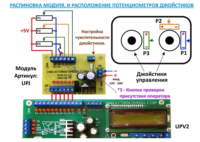 Підключення модуля показано на зображеннях нижче. Єдине на що потрібно звернути увагу це підключення живлення на потенціометри в джойстиках!!! Їх потрібно підключити саме від зазначеного гнізда модуля на 5V, інакше вийде з ладу мікроконтролер. Контакти кнопки *S (перевірка присутності оператора) якщо не будете використовувати, то треба підключити на мінус. Схематичне розташування трьох потенціометрів ждойстиків вказано на малюнках. У модулі передбачена можливість регулювати чутливість реагування на відхилення джойстиків від звичайного нейтрального положення.