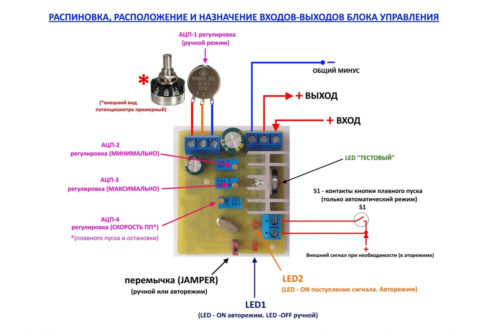 Четвертий канал АЦП - відповідає за плавність старту та зупинки. І може бути відрегульований в межах: від 1 секунди - до 60 секунд, тобто повна швидкість розвивається плавно в АВТОМАТИЧНОМУ РЕЖИМІ, за час виставлений цим параметром (параметр активний тільки в автоматичному режимі), зупинка відбувається автоматично після відсутності останнього позитивного сигналу на термінал блоці, з плавною зупинкою, в 10 разів швидше за старт, щоб пом'якшити можливий гідроудар. Якщо плавна зупинка не потрібна – вкажіть це при замовленні, буде відкориговано прошивку.