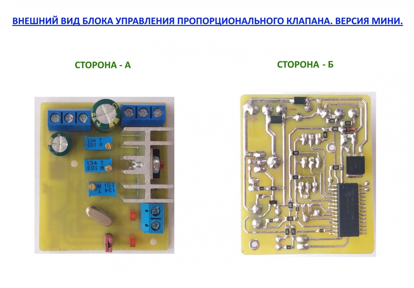 Всі регулювання робляться шляхом прокручування викруткою гвинтиків багатообертових резисторів для точного налаштування параметрів. Прокручування за годинниковою стрілкою – збільшує параметр, прокручування проти годинникової стрілки – зменшує параметр. Після налаштування трьох параметрів АЦП модуль готовий до роботи. Клапан потрібен саме пропорційний (ну це й так зрозуміло), адже звичайний електроклапан має лише два стани: відкритий та закритий. Модуль має захист від переплюсування, неправильної подачі живлення.