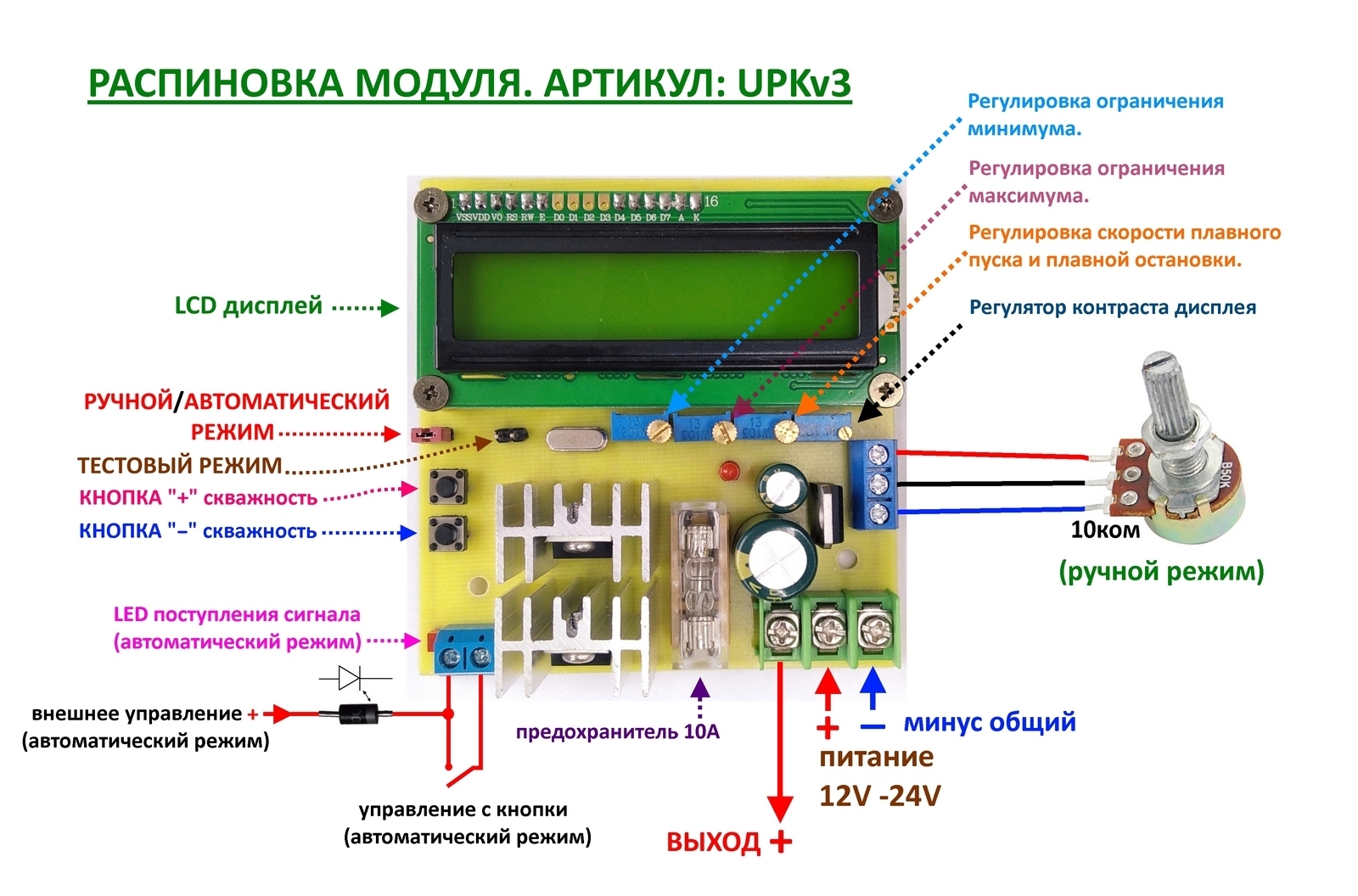 Третій канал АЦП - відповідає за плавність старту та зупинки. І може бути відрегульований в межах: від 3-х секунд до 60 секунд, всього 255 швидкостей. Тобто повна швидкість розвивається плавно в АВТОМАТИЧНОМУ РЕЖИМІ, за час виставлений цим параметром (параметр активний тільки в автоматичному режимі), зупинка відбувається автоматично після відсутності останнього позитивного сигналу на термінал блоці, з плавною зупинкою, в рази швидше ніж старт, щоб пом'якшити можливий гідроудар. Якщо плавна зупинка не потрібна – вкажіть це при замовленні, буде відкориговано прошивку.