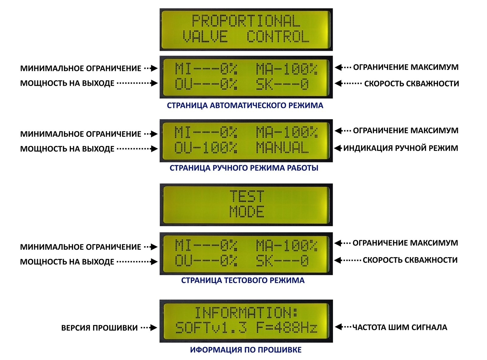 Ручний режим. Для роботи в ручному режимі встановіть перемичку (JAMPER) у перший роз'єм. Встановіть за допомогою потенціометрів необхідні налаштування під пропорційний клапан. Всі необхідні дані будуть відображатися на дисплеї в реальному часі, опис інформації, що виводиться на дисплеї, наведена на зображення виставлене на цій сторінці сайту. За потреби можна переходити з Автоматичного режиму до Ручного режиму без вимкнення живлення. У ручному режимі 4-й потенціометром можна регулювати подається ШІМ сигнал на пропорційний клапан у встановленому "коридорі". Сигнали отримані від кнопки або із зовнішніх джерел не опитуються (не задіяні).