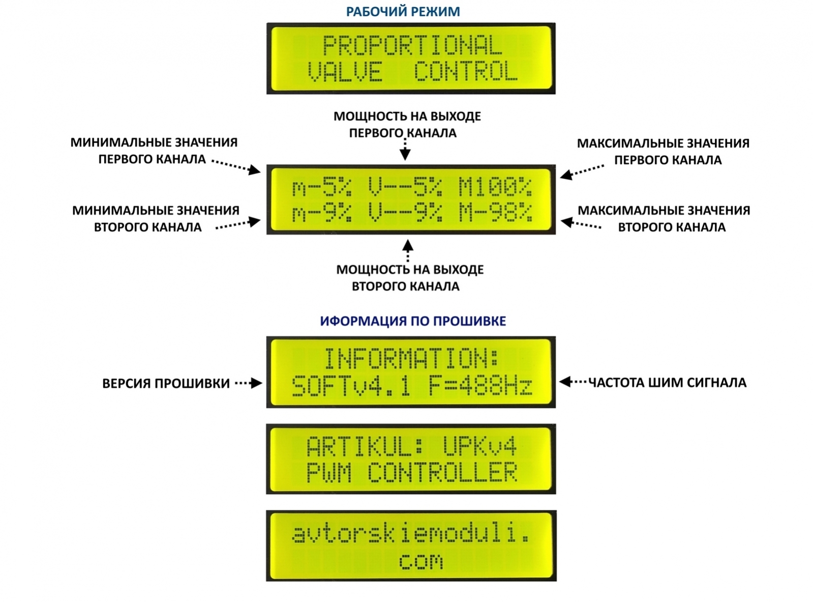 Модуль підключається згідно з виставленою схемою. Після підключення модуля з'явиться можливість керувати відразу двома пропорційними клапанами від одного джойстика. Одним модулем можна керувати лише двома пропорційними клапанами, але при необхідності можна у будь-який момент збільшити це число, докупивши необхідну кількість таких модулів. А також якщо знадобиться в процесі експлуатації дисплей модуля зможете вивести на видному місці, підпаявши шлейф від модуля до дисплея. Після підключення модуля його потрібно відрегулювати під гідравлічну систему. Модуль має 5 каналів AЦП (аналого-цифровий перетворювач, далі АЦП). У чому полягає принцип роботи АЦП мікроконтролера? Аналого-цифрові перетворювачі є приладами, які фізичну величину перетворюють на відповідне числове уявлення. Тобто за допомогою зміни опору резисторів, перетворюють фізичну величину на відповідне числове уявлення. Всі регулювання робляться шляхом прокручування викруткою гвинтиків багатообертавих резисторів для точного налаштування параметрів. Прокручування за годинниковою стрілкою – збільшує параметр, прокручування проти годинникової стрілки – зменшує параметр. Після налаштування 4 параметрів АЦП модуль готовий до роботи. П'ятий вхід АЦП підключається до джойстика. Клапан потрібен саме пропорційний (ну це й так зрозуміло), адже звичайний електроклапан має лише два стани: відкритий та закритий. Модуль має захист від неправильної подачі живлення. Кожен канал АЦП відповідає за свій параметр: