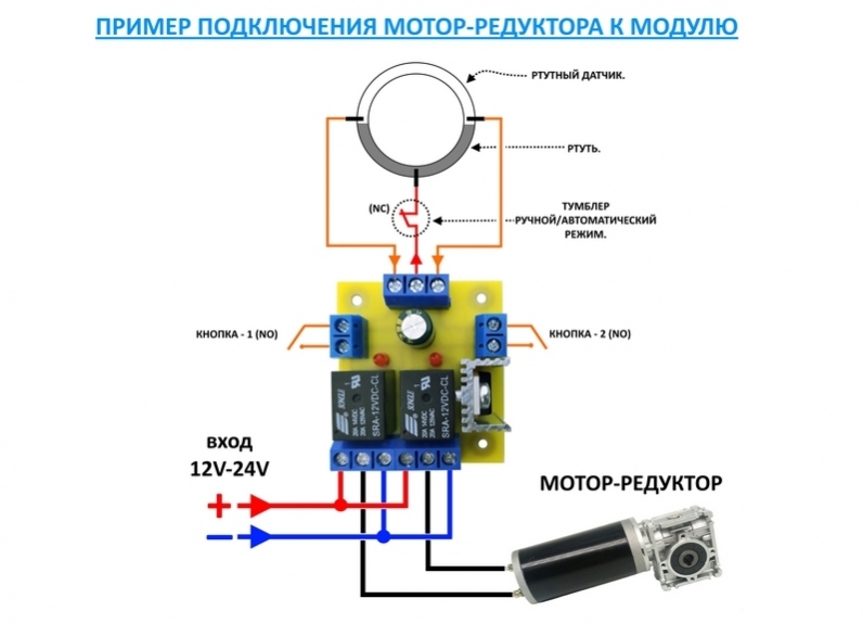 А також даний модуль можливо використовувати для повороту люльки навколо своєї осі, у такому випадку ртутний датчик не підключаємо а на його місце підключаємо тумблер з нейтраллю або перемикач з нейтраллю, можна керувати і за допомогою двох кнопок які вказані на зображенні - в такому випадку на термінал де підключається ртутний датчик, нічого не підключаємо.