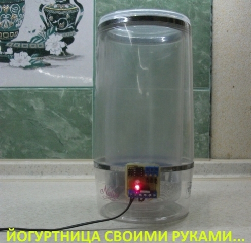 Корпус йогуртниці в моєму випадку це пластиковий термо футляр для подачі пляшок вина або мінеральної води на стіл (валявся без діла), ємністю для йогурту служить пластикова вимірювальна колба на 1L для харчових продуктів. Розсіювачем тепла служить алюмінієвий радіатор від транзистора розміри 7х7х4 см (застосував те, що було, а можна було застосувати і шматок металевої пластини). Нагрівальні елементи - три 5 ватні керамічні резистори. Джерело живлення це блок живлення на 19V 3A від ноутбука, але для живлення моєї йогуртниці цілком вистачало б і блок живлення на 12V і 1-2А, але такого в господарстві не знайшлося. Після того як всі необхідні матеріали були зібрані, і загальна картина стала ясна, взявся за розробку автоматичного модуля, що вміщує два пристрої в одному флаконі, таймер і термостат, і буде серцем і мізками йогуртниці. Модуль виготовлений на базі мікроконтролера, а як інакше? У світі без них ніяк. Написав прошивку, перевірив у "залізі", виправив кілька разів, оптимізував доки не досягнув потрібного результату, зібрав модуль, встановив його, і зібрав усі компоненти разом. Після цього купив закваску та молоко. Я думав що перший млинець вийде комом, тому що налаштування ще не були зроблені, але десь раз на годину коригував температуру, і вранці скуштував йогурт, це був смачний свіжий йогурт - і порівняти його з магазинним гріх. Як то кажуть: Правильні бджоли – роблять правильний мед.