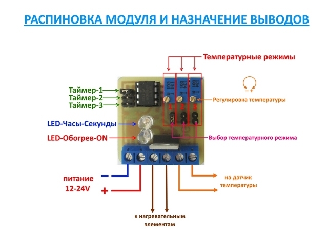 Опис електронного модуля. Модуль я вирішив зробити автоматичним, але з можливістю змінити налаштування при необхідності, і при потребі навіть застосувати в інших пристроях, де використовуються такий же принцип роботи. Інформація обробки даних із термодатчика обробляється методом АЦП. На модулі є дві групи перемичок - джамперів, кожна група складається з трьох перемичок. З їх допомогою можна вибрати один із трьох таймерів. І один із трьох температурних режимів.