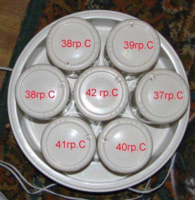 Потім пошукав інформацію про перегрівання йогурту з фотозвітом та результатом. Результати вимірювання були такими: Нагрів вмісту баночок нерівномірний, баночка яка всередині гріється сильніше, ніж ті, що по колу, всередині банки біля дна одна температура, посередині інша, зверху третя. Вимірювання були зроблені у кімнаті, при температурі 25°С.